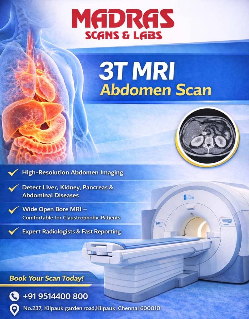 If you are looking for a reliable 3T MRI abdomen scan in Chennai, Madras Scans & Labs offers advanced technology, patient-friendly care, and trusted diagnostic excellence.