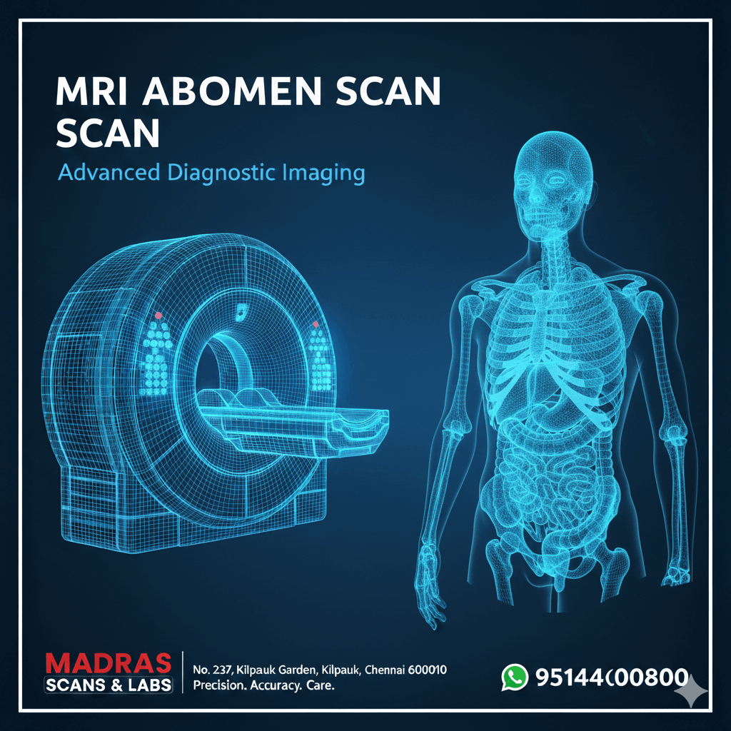 An MRI Abdomen is a non-invasive imaging test that provides detailed pictures of the organs and structures within the belly. At Madras Scan & Labs, we use advanced technology to capture high-contrast images of soft tissues, making it easier to diagnose complex conditions of the digestive and urinary systems.
