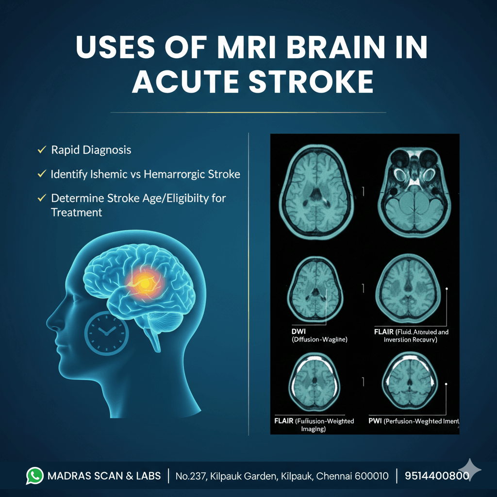 MRI Brain is an essential imaging tool in acute stroke management, enabling early diagnosis, accurate classification, and effective treatment decisions. Timely MRI scanning can be life-saving and disability-preventing.