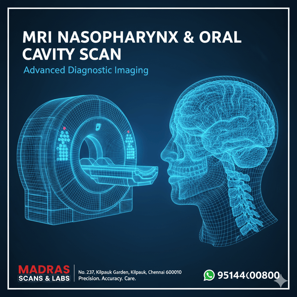 An MRI of the Nasopharynx and Oral Cavity is a specialized, non-invasive imaging procedure used to obtain detailed cross-sectional images of the soft tissues in the head and neck region. This scan is vital for evaluating the tongue, salivary glands, throat, and nasal passages.